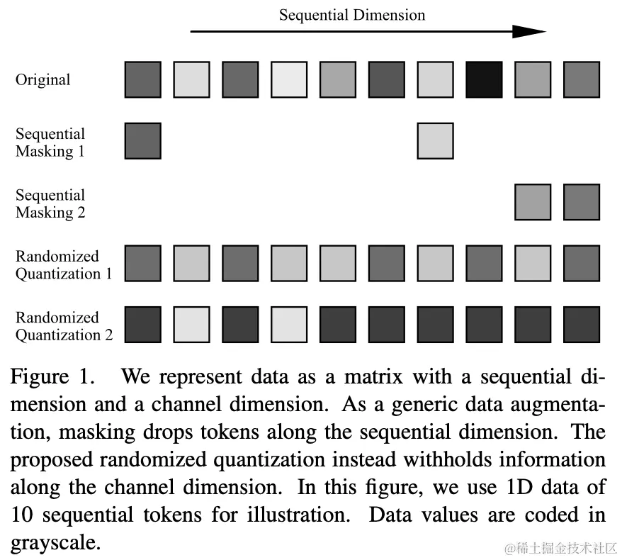 一般性地,输入数据可以被表征为由序列维度(sequential)和通道维度(channel)组成的二维向量。其中序列维度通常是模态相关的,例如图像上的空间维度、语音的时间维度以及语言的句法维度。而通道维度是模态无关的。在自监督学习中,masked modeling [1] 或者以 masking 作为数据增强 [2] 已经成为一种有效的学习方式。然而这些操作都作用于序列维度。为了能够广泛应用于不同数据模态,本文提出一种作用于通道维度的数据增强手段:随机量化(randomized quantization)。每个通道中的数据通过非均匀量化器进行动态量化,量化值是从随机划分的区间中随机采样的。通过这种方式,落在同一个区间内原始输入的信息差被删除,同时不同区间数据的相对大小被保留,从而达到 masking 的效果。