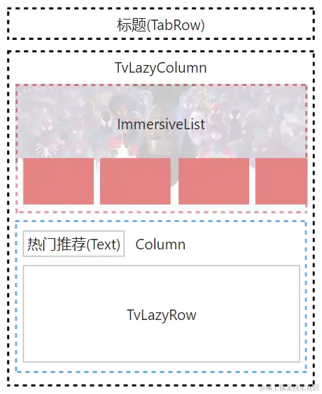 TvLazyColumn 每行又包含了 TvLazyRow 横向布局 (如果是固定的几个,可以用 Row。