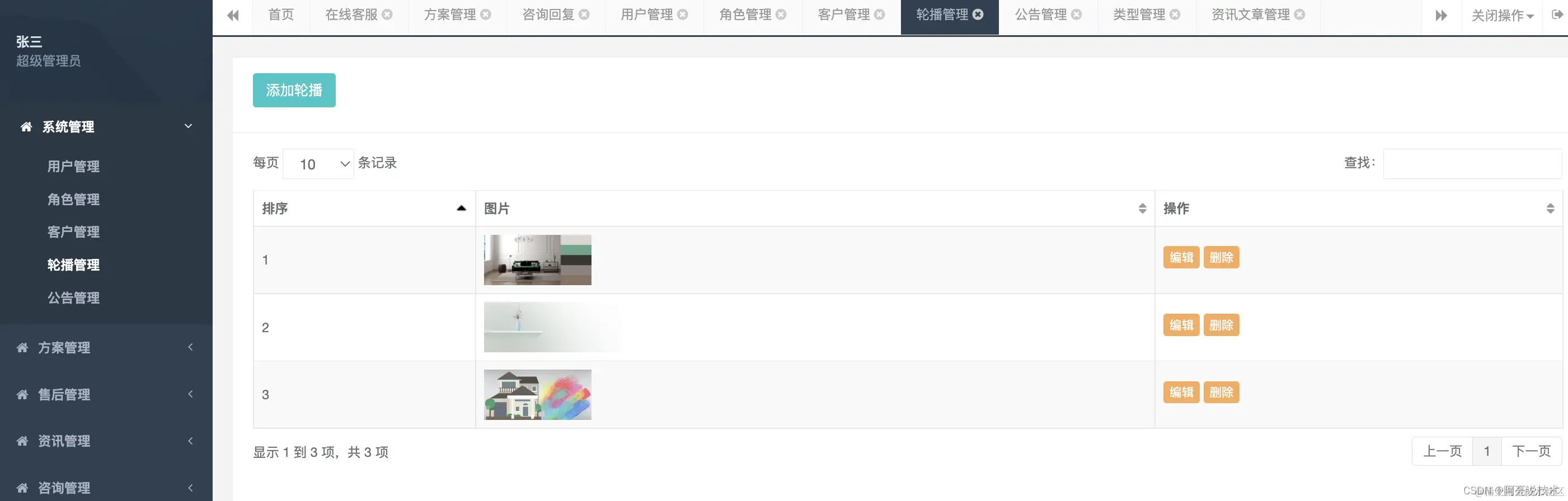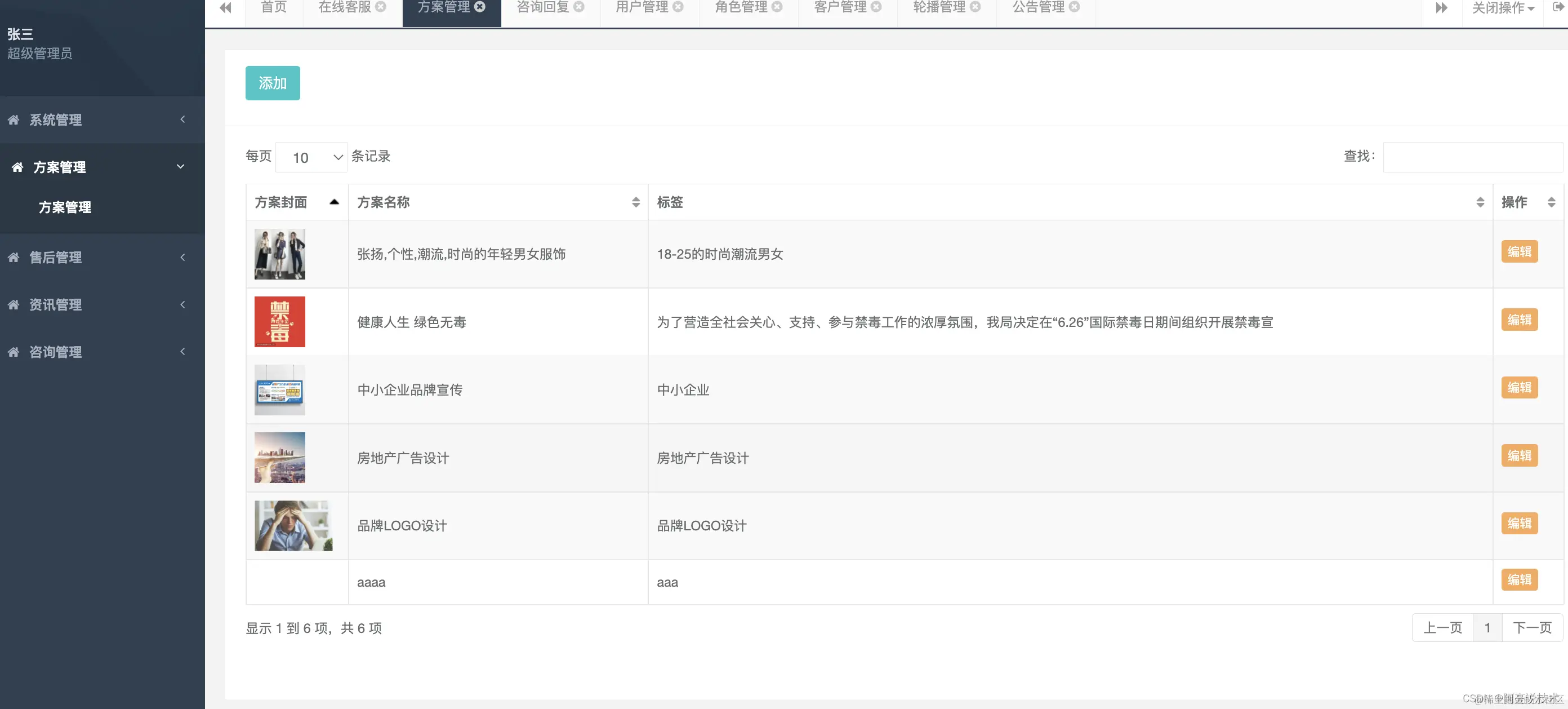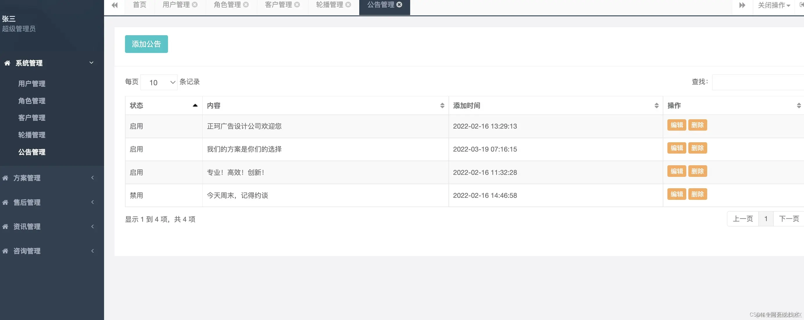 后台管理功能: 系统管理分为: 用户管理 角色管理 客户管理 首页轮播管理 公告管理 方案管理: 方案管理 资讯管理: 类型管理 资讯文章管理