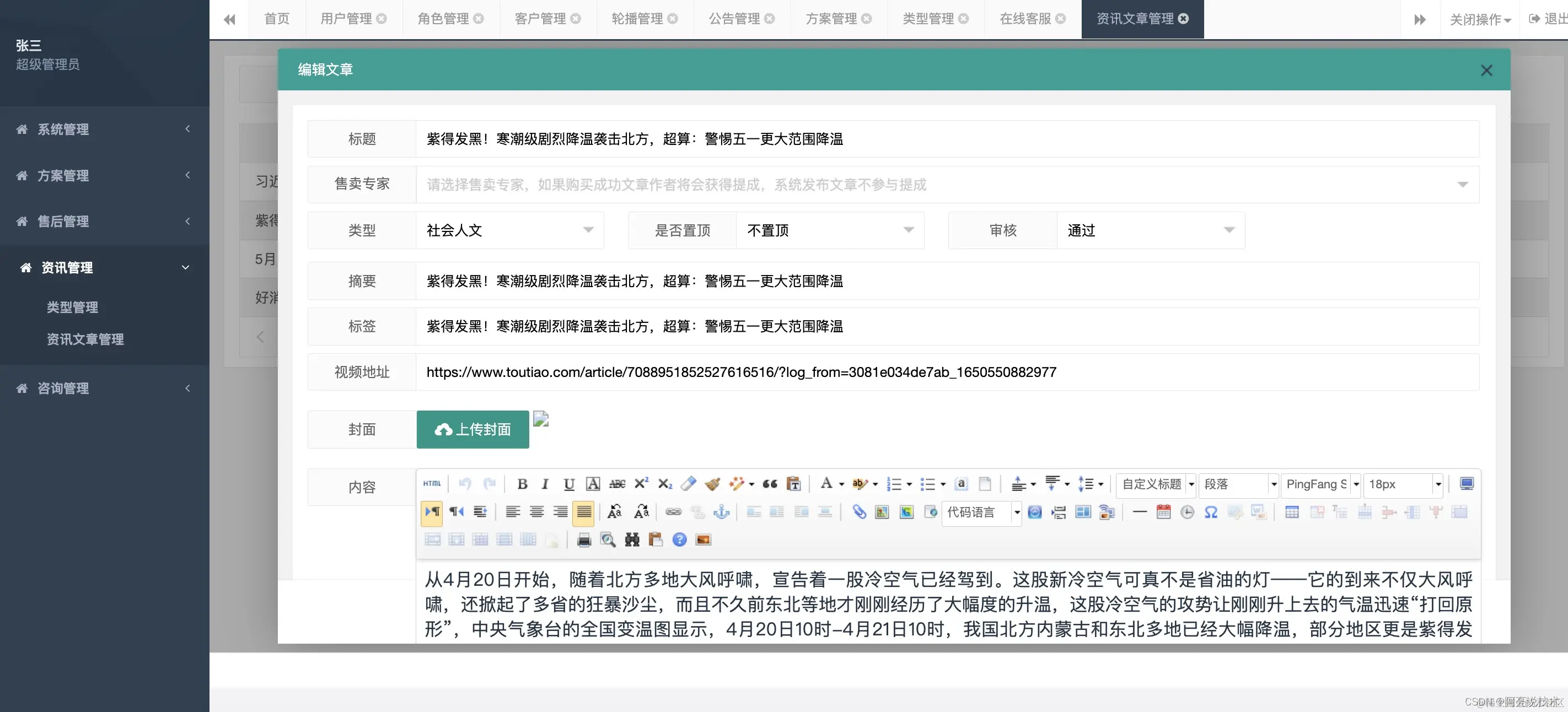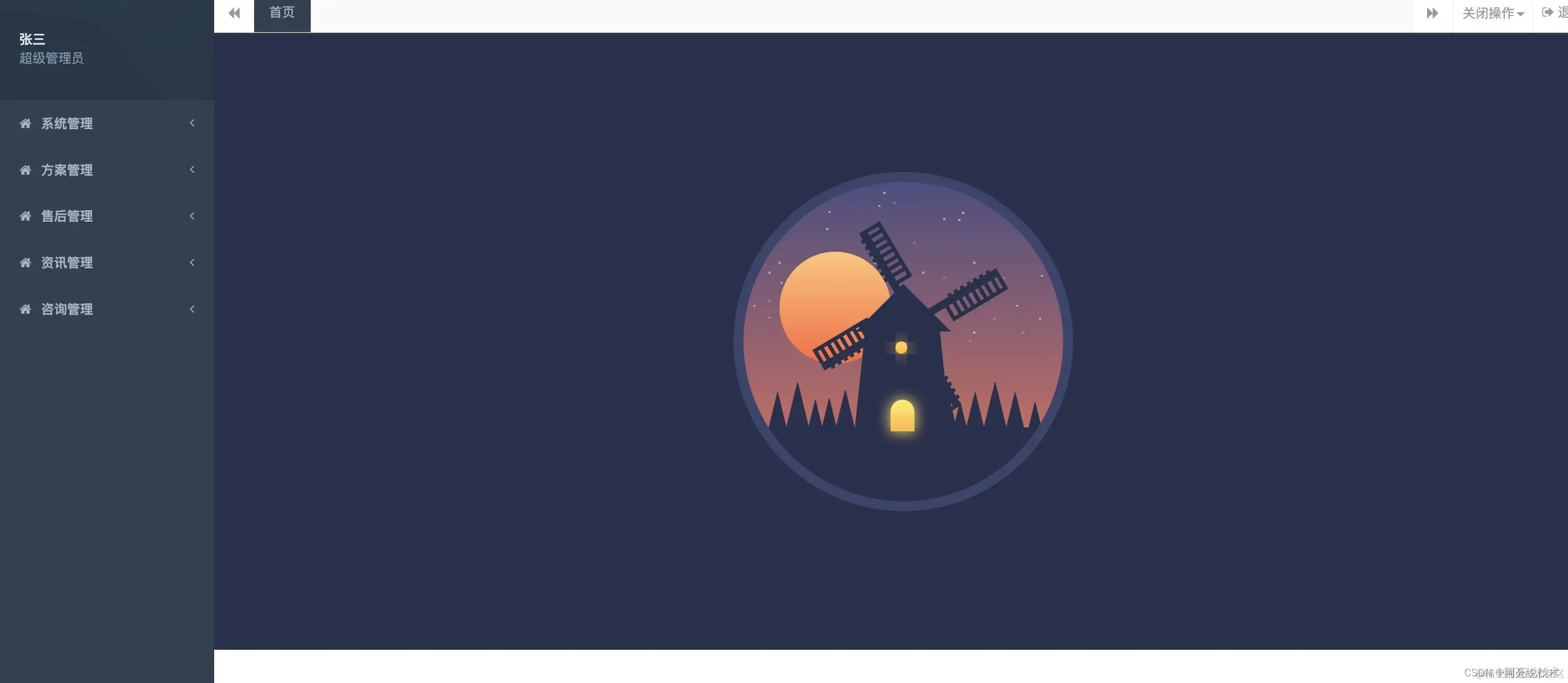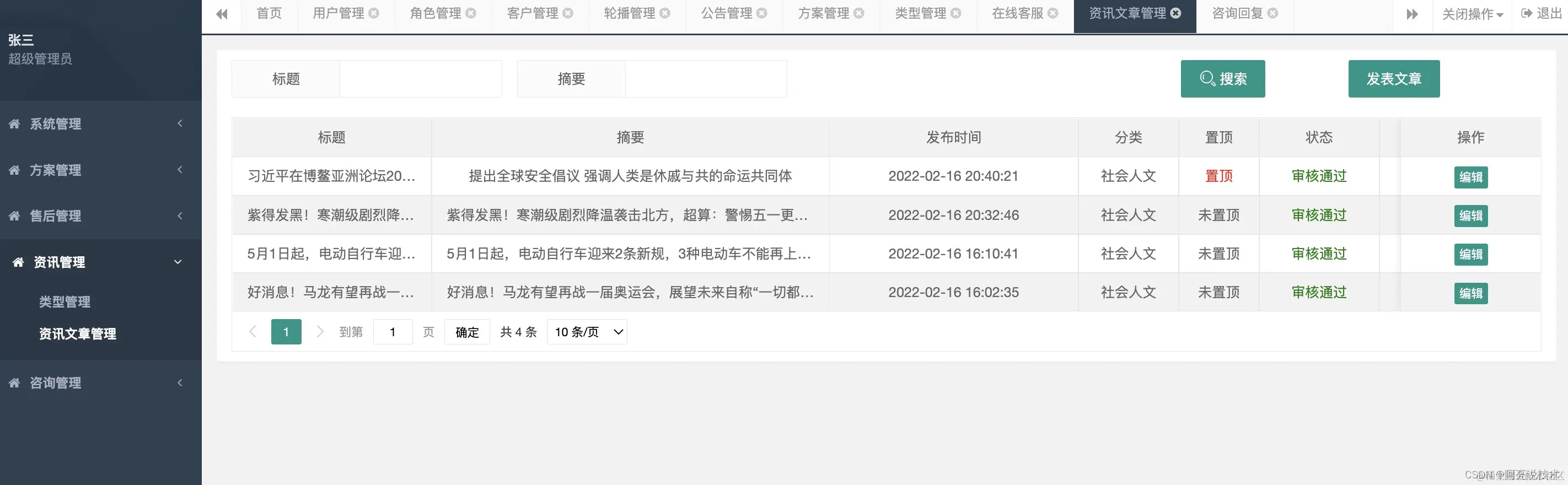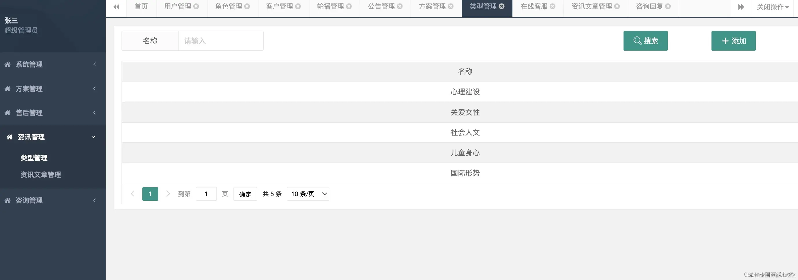 后台管理功能: 系统管理分为: 用户管理 角色管理 客户管理 首页轮播管理 公告管理 方案管理: 方案管理 资讯管理: 类型管理 资讯文章管理