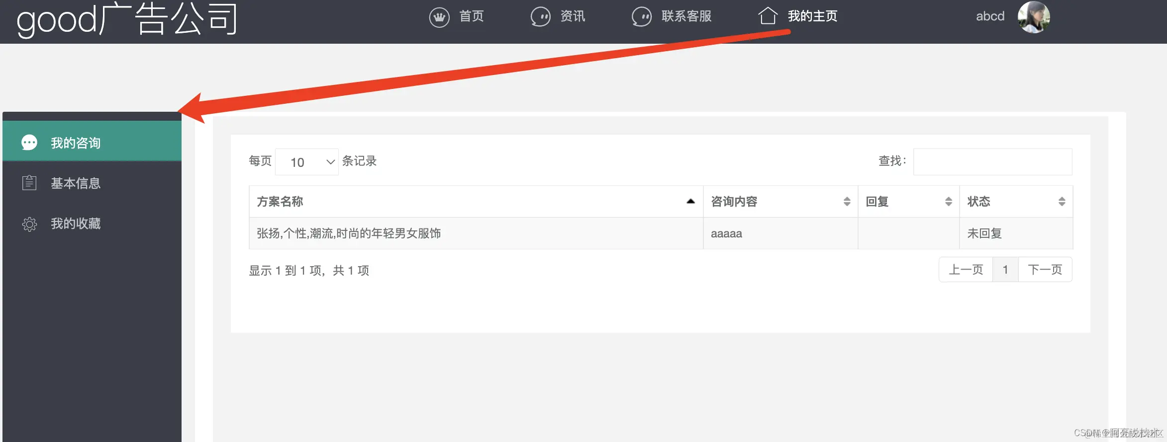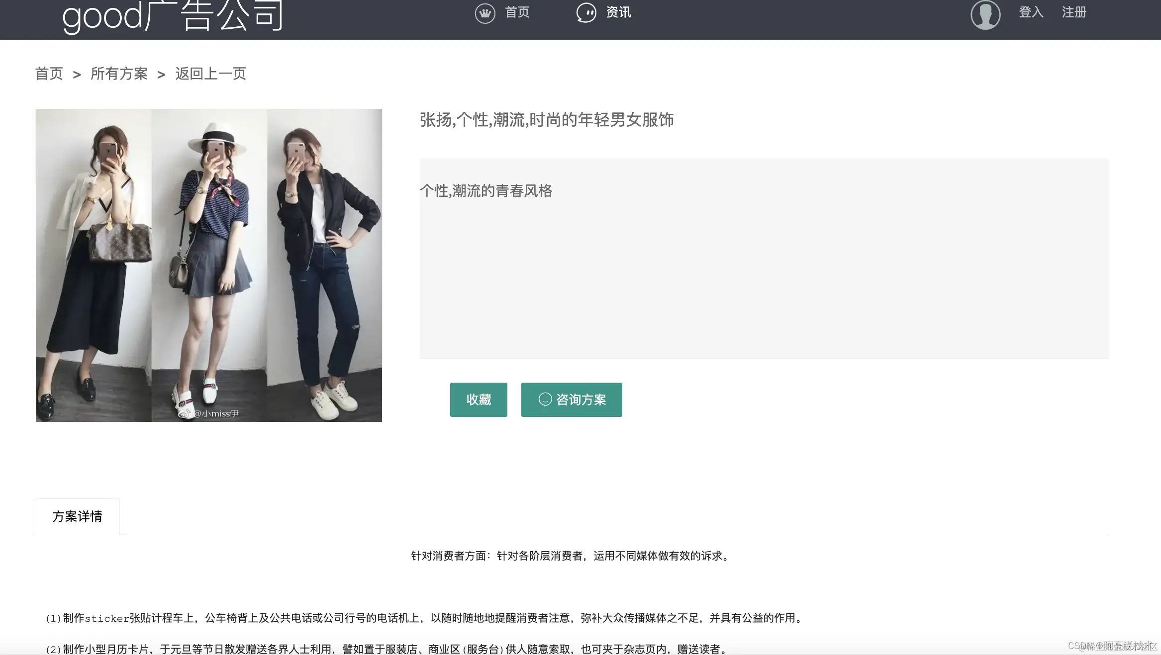 首页功能: 广告展示 方案列表 站内搜索 资讯 查看详细咨询 登录注册 收藏 咨询方案 在线客服实时聊天