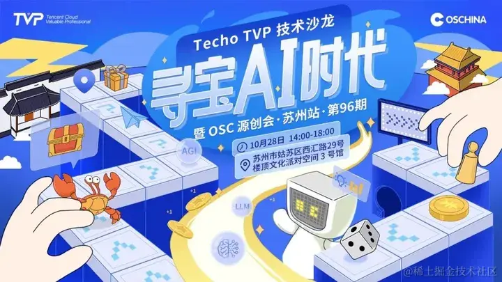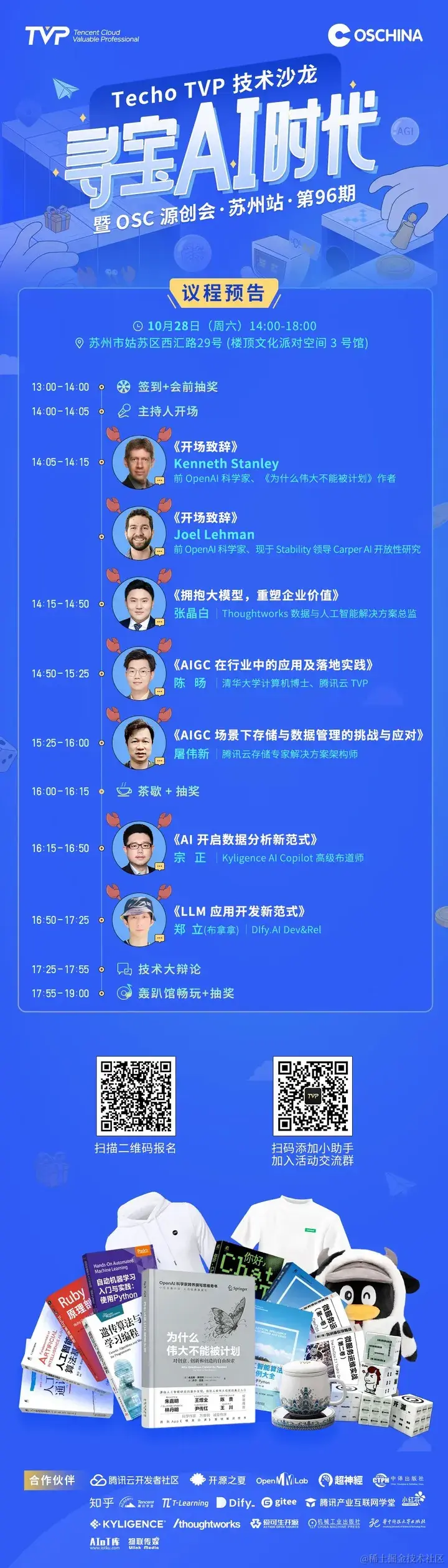 因此,我们将于 10 月 28 日(本周六)在苏州举办「寻宝 AI 时代 —— Techo TVP 暨 OSC 源创会技术沙龙」,特邀 AI 领域知名技术专家,分享自己在 AI 领域的技术故事、成果、经验,以期为更多开发者们展示当下 AI 世界的各种新玩法。如果你想为自己加码,也欢迎来看看 AI 世界的新可能!