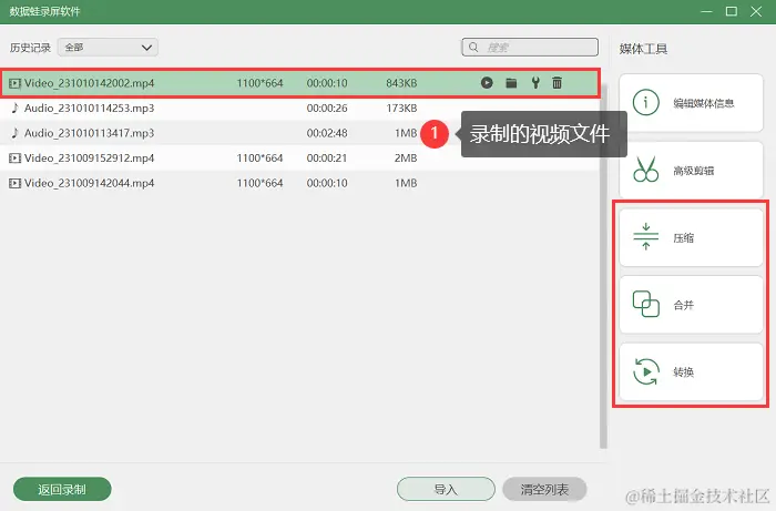 第四步:在历史记录页面,您可以重新找到以前录制过的视频,并对它进行合并、压缩、转换等相关操作。