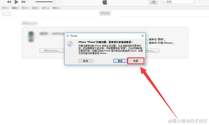 步骤2:当iTunes检测到手机后,电脑会弹出一个提示窗口,点击【恢复】按钮,然后根据iTunes提示继续进行操作即可。