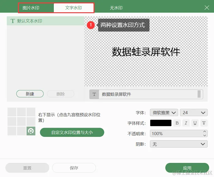 步骤3:如果您想对视频添加自己的水印,可以点击下方 “录制水印” 功能,水印支持文字水印与图片水印,设置完毕后就可以开始录屏了。