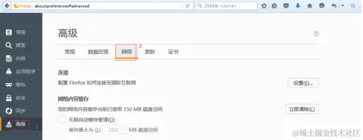 2、在新打开的about:preferences#advanced窗口中,依次点击【高级】-【网络】,我们将会看到FireFox连接网络的设置选项。