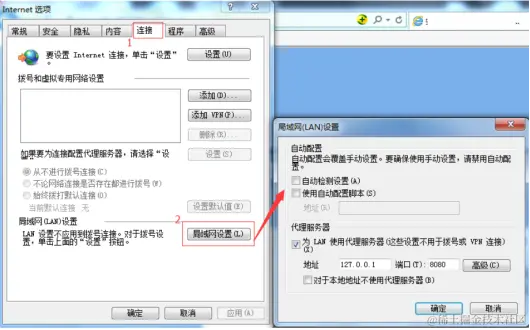 点击【更改代理服务器设置】,windows系统下将会弹出IE浏览器的代理设置,此时,按照IE浏览器的设置步骤,完成代理服务器的配置即可。