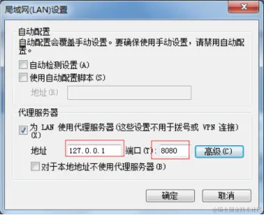 4、在代理服务器设置的地址输入框中填写127.0.0.1,端口填写8080,点击【确定】,完成代理服务器的设置。