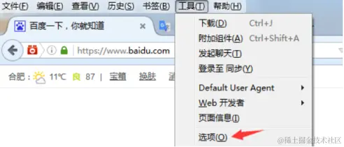 1、启动FireFox浏览器,点击【工具】菜单,点击【选项】。
