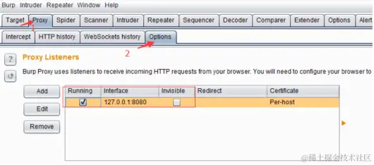 当Burp Suite 启动之后,默认分配的代理地址和端口是127.0.0.1 :8080,我们可以从Burp Suite的proxy选项卡的options上查看。如图: