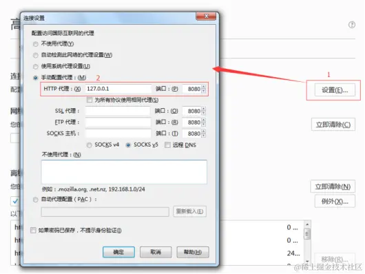 3、点击【设置】,在弹出的【连接设置】对话框中,找到“http代理”,填写127.0.0.1,端口填写8080,最后点击【确认】保存参数设置,完成FireFox的代理配置。