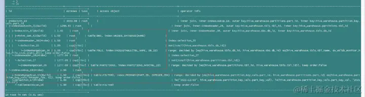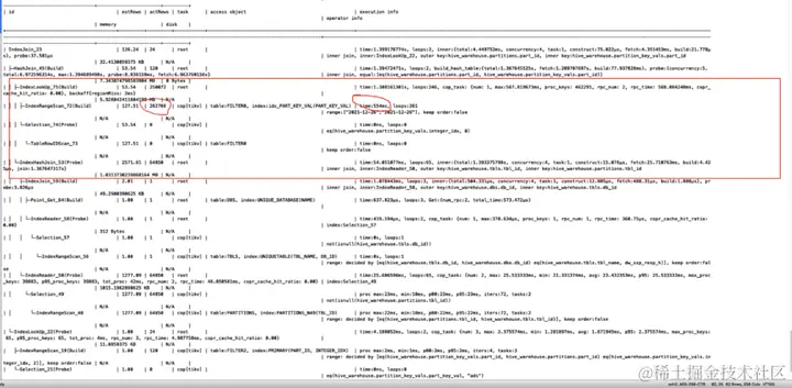 若执行计划不走 idx_PART_KEY_VAL 索引,TiDB 可通过 dbs、tbls 检索出所有关联 partition 数据,在根据 part_id 和过滤条件扫描 PARTITION_KEY_VALS 数据并返回。此类执行计划扫描的数据量和需要查询的表的分区总量有关,如果该表只有少数的分区,则查询能够迅速响应,但如果查询的表有上百万的分区,则该类执行计划对于该类查询不是最优解。