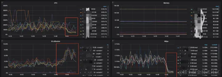 - 在机器资源使用情况上整体磁盘使用率在 10%以下;在没有热点数据访问的情况下,CPU 平均使用率在 12%;CPU.WAIT.IO 平均值在 0.025%以下;集群不存在资源使用瓶颈。