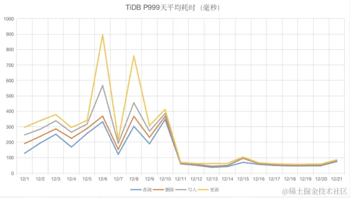 除 TiKV 负载有明显的降低,TiDB 的整体性能也得到明显的提升,各项操作耗时呈量级降低。以下整理了 TiDB 增删改查的天平均耗时情况:
