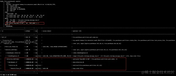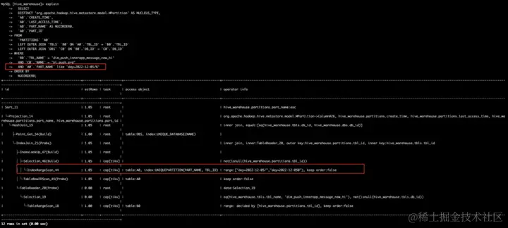 在实际生产中元数据基本都是按天分区为主,每天增长大概有 26w 左右,且范围查询的使用场景较多,使用 idx_PART_KEY_VAL 索引查询的执行计划不太适合线上场景,故该索引需不适合添加到线上环境。