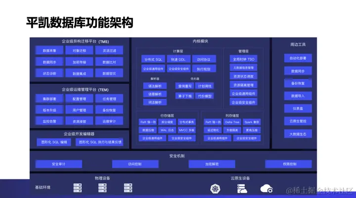 上图是平凯数据库(TiDB 企业版)功能架构全景图。中间部分是平凯数据库的内核模块,包括计算层、管理层和存储层。计算层负责数据请求的解析、优化和执行;存储层包括行存、列存,负责对数据存储进行分布式一致性管理;管理层负责全局的调度和元数据信息管理。右侧是平凯数据库的配套周边工具,包括自动化部署、数据同步、备份恢复、数据导入、云原生管控、仪表盘、大数据生态等等。左侧是平凯数据库的三个图形化组件,包括企业级异构迁移平台 TMS,它提供数据的采集、迁移、过滤、同步、加密传输、比对等等一系列功能,帮助用户将业务从 Oracle 数据库迁移到平凯数据库;企业级运维管理平台 TEM,帮助用户通过一个图形化的统一运营管理平台,一体化管理几十套集群,甚至上千个平凯数据库服务器,提供数据库集群的部署、配置、升级、备份恢复、监控告警等任务,通过一套完整的运维平台,用户可以轻松降低管理的复杂度和运维成本;企业级开发编辑器 SQL edit,可以帮助平凯数据库的开发者和管理者进行图形化的 SQL 编辑交互操作、并将执行与结果反馈在图形化平台界面上,提高 SQL 的编辑效率。在整个功能架构图的最下面是平凯数据库的安全机制。针对敏感数据,平凯数据库专门增强了安全机制,包括审计、档案控制、加密解密、权限控制。在安全方面,平凯数据库严格符合国标、行标,让用户用起来放心。最后,平凯数据库提供灵活的基础设施部署方式,无论在 X86 体系下还是在国产化的体系下,均支持物理机环境和云化环境的部署方式。