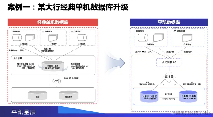 案例一是某大行的经典单机数据库升级。上图左侧是一个 Oracle 的经典数据库一体机系统。各个交易系统把交易明细通过夜间平移写入数据库一体机来处理,作为会计引擎业务,再同步给数仓系统。客户的挑战一方面是这个单机系统,无论数据容量,还是处理能力,都已经无法满足业务的快速发展,装不下,也算不出来,这是单机系统的上限限制。右侧是迁移到平凯数据库之后的情况,超过八天的数据量放在 A 集群里面,这部分数据更重要,可靠性要求更高,承载着 100% 的读写逻辑。八天之后的放在 B 集群,由于它主要承担读的负载,容量非常少,所以大大减少机器的配置。可以看出,在新的架构上面,无论是存储容量,还是数据库的处理能力,都获得了大幅度提升,能够很好满足客户业务快速发展的需求,给客户带来一个全新的支撑能力,满足客户未来十年、二十年的发展需要,这也是分布式数据库横向扩展能力的体现。