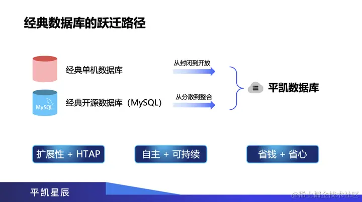 数据库的迁移路径主要有两类,一种是经典的单机数据库。比如从 Oracle 迁移到平凯数据库,这是由一个从封闭的、闭源的数据库、闭源的生态,迁移到一个开放的生态,开源的数据库产品;另一种就是从经典的开源数据库,比如 MySQL,迁移到平凯数据库来,通常是从分散到很多个 MySQL 实例上整合到一个平凯数据库集群。在这种迁移中,用户就获得了更强的扩展性,以及 HTAP 的能力,获得了自主和可持续的能力与生态,同时带给用户省钱、省心两方面的价值。