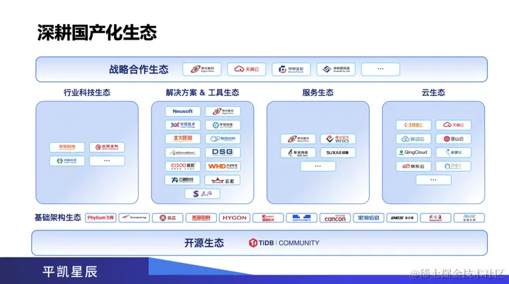 在国产化生态方面,平凯数据库依托 TiDB 的开源社区,从基础架构、行业科技、解决方案、服务、交付、云、战略合作等等各个方面,实现了全方面的国产化生态兼容。在基础架构方面,支持飞腾、鲲鹏、兆芯、龙芯等生态,全面兼容国产服务器技术架构;在行业方面,支持包括平安科技、北银金科、中国太平等等行业科技生态;在解决方案和工具生态方面,支持包括东软、华润、神州数码、宇信等等行业配套解决方案;在产品交付、服务生态方面,也有包括神州数码在内的众多合作伙伴,一起为客户提供高质量的交付;在云方面,与包括阿里云、移动云、金山云、青云等都有全面合作;在战略合作生态方面,与神州数码、天翼云、中电金信、中科软等等都是战略合作伙伴。