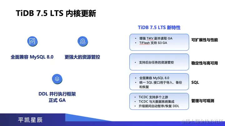 顺便介绍一下 TiDB 7.5 LTS 版本,作为 TiDB 内核的稳定版本,它将在年底发布,会推出更多的内核特性,全面兼容 MySQL 8.0、更强大的资源管控能力,DDL 并行执行框架正式发布等等。TiDB 内核将在可扩展性、性能表现方面全面提升,同时稳定性、高可用性、SQL、管理可观测性等方面也将大幅提升。右侧是 TiDB 7.5 LTS 详细的新特性,包括增强 TiKV 副本读写能力,TiFlash 支持 S3 存储,支持后台任务的资源管控,用 SQL 接口支持导入、备份和恢复,TiCDC 支持多个上游和大数据系统的集成,升级期间自动暂停/恢复 DDL 等等。