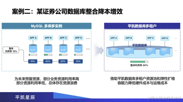 案例二是某证券公司的数据库整合的降本增效。左侧是该公司从前使用的多个 MySQL 实例方案,有多个 MySQL 节点,多个库,多个实例。由于它需要为未来业务增长预留资源,所以造成部分业务资源的利用率高,部分资源的利用率非常低,总体上资源是非常浪费的。从图中可以看到占有率是 10%、40%、20%、10%,这对硬件资源的浪费非常大。现在几乎所有用户都要求降本增效,从右侧图可以看出,通过一套平凯数据库集群,借助多租户的资源池能力、弹性扩缩容的能力,用户的硬件成本和运维成本降低了 40%。同时,一套平凯数据库集群承担这么多业务,整体的资源利用率却达到 80%,给客户带来了极大的成本节约,运维成本也极大降低了。