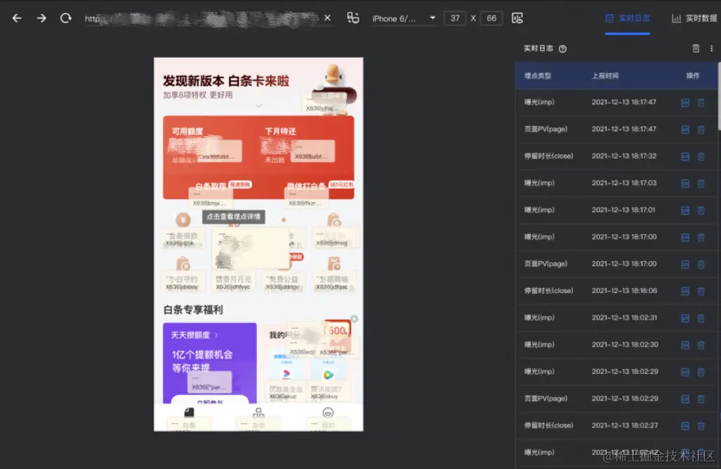 为此作者团队研发了埋点可视化工具,完美解决了上述问题。只要输入页面URL,选择合适的设备大小,页面哪些元素有埋点就呈现出来。每个坑位的埋点ID,点击曝光的数据只要点击一下浮框即可见。埋点可视化工具还支持查看实时上报的日志和汇总的实时数据。