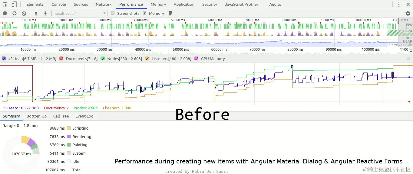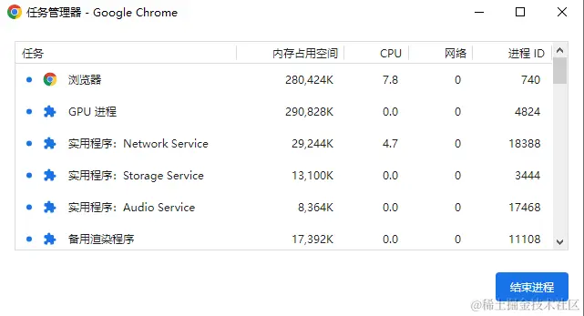 任务管理器(不要与操作系统的任务管理器混淆)提供了浏览器中所有选项卡和进程的概览。Chrome 中,可以通过在 Linux 和 Windows 操作系统上按 Shift+Esc 来打开任务管理器;而在 Firefox 中,通过在地址栏中键入 about:performance 则可以访问内置的管理器,它可以显示每个标签的 JavaScript 内存占用情况。如果网站停留在那里什么都不做,但 JavaScript内存使用量逐渐增加,那很可能是存在内存泄漏。