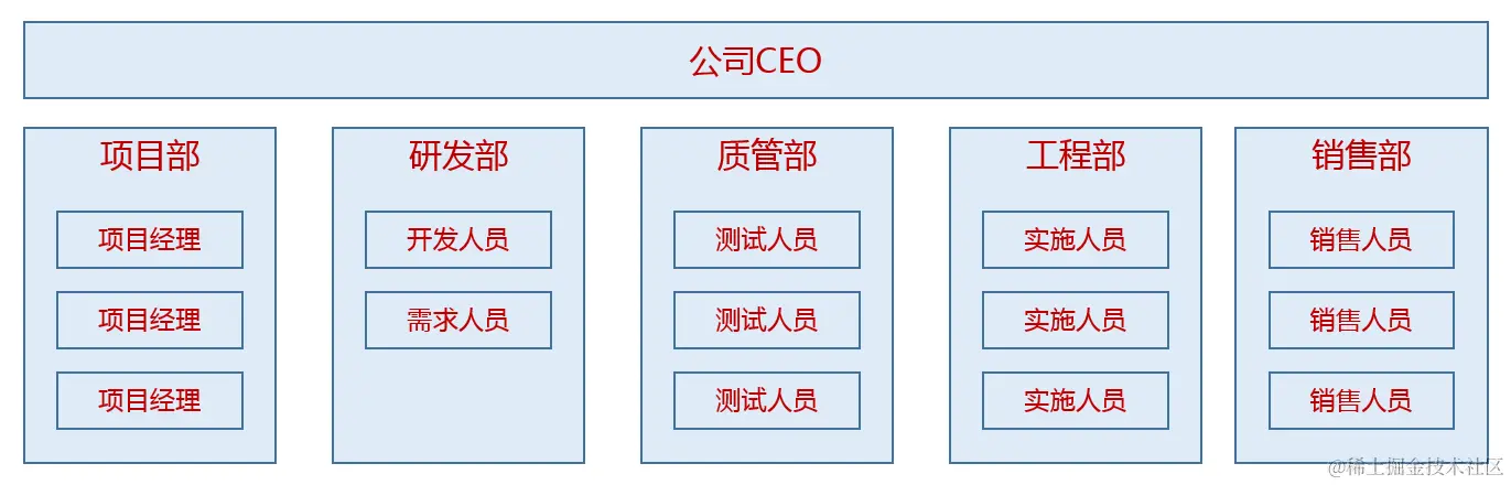 这种组织架构是典型的职能型组织模式,各部门分工明确、职责清晰,项目部里面全都是项目经理,负责项目统筹和横向拉通的;研发部里面有开发人员和需求人员,负责项目研发交付的;质管部里面都是测试人员,负责质量管理和版本发布的;工程部里面都是实施人员,负责系统部署和实施的。通常一个项目会配置专职的项目经理和实施人员,这个是铁打不动的用户要求的,是标配,而研发人员和测试人员则可能会服务于多个项目,尤其是同时服务于多个业务类同的项目。因为只有同一拨人服务于同类型的项目群,那这拨人才会有驱动力去考虑抽象业务、封装服务、共享组件,从而达到成果复用和降本增效的目的。