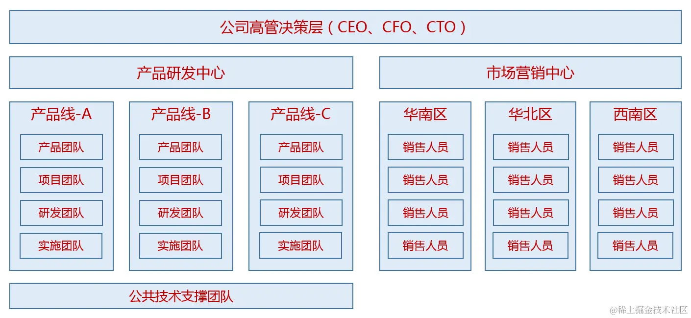 随着公司业务的不断发展和丰富,项目会越来越多,相应的人员也会越来越多(已经有100大几十号人),这个时候你会发现原来强矩阵式的项目制组织模式暴露出诸多问题,因为各个项目组都是各干各的,人员和成果完全没有复用,重复造轮子的事情常有发生,更要命的是有若干项目组实际上是干着类似的业务,只是服务的客户不同,大家做出来的东西无论从功能还是风格都千差万别,而当后面又来了一个类似业务的项目又是重新做一遍,导致人力和成本极大的浪费。按照软件工程的角度上来说,以前都是面向过程来开发,而不是面向对象来开发,这个时候公司开始提业务抽象和功能复用,在满足用户个性需求的同时,又能最大程度的减少重复建设。于是,公司开启了新的组织变革:
