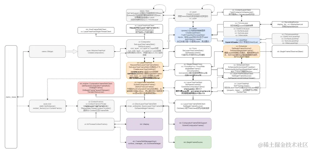不同的 cc client 有自己的 paint 方式,比如 views 和 blink 都是 cc 的 client,他们有各自不同的 paint 逻辑,但是其他比如 commit,raster 等都是一样的逻辑,因此如果要学习 cc 可以从 views 入手,不必一开始就深入到 blink 中。 下面是基于这个 demo 的 cc 类图: