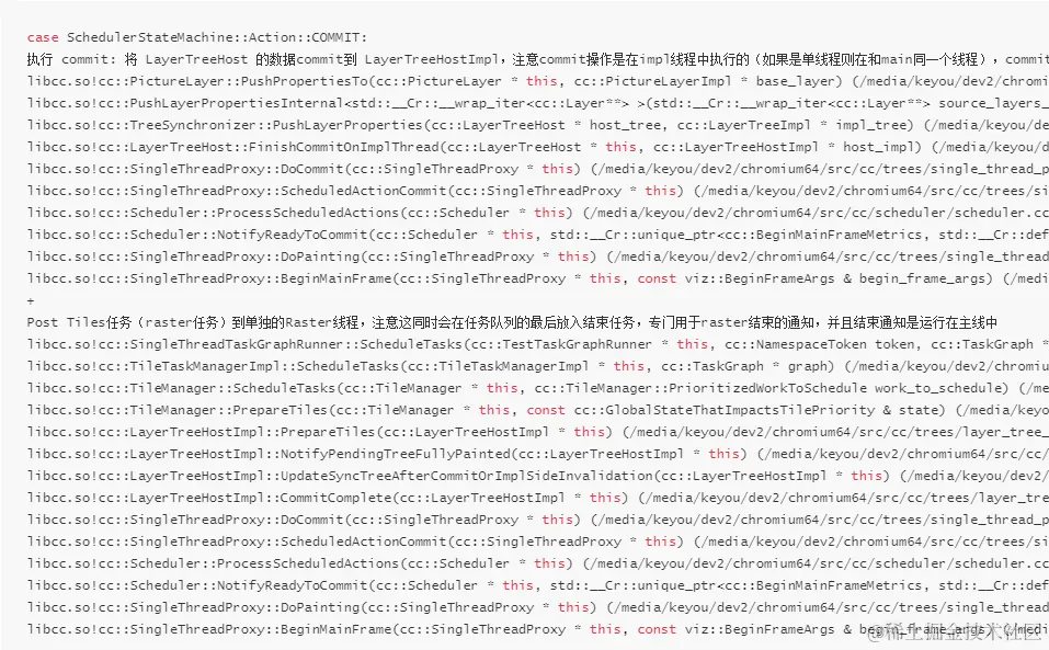 Commit 阶段的核心作用是将保存在 cc::Layer 中的数据提交(PushPropertiesTo)到 cc::LayerImpl 中。cc::LayerImpl 和 cc::Layer 一一对应,只不过运行在 Compositor 线程中(也称为 Impl 线程)。在 Commit 完成之后会根据需要创建 Tiles 任务,这些任务被 Post 到 Raster 线程中执行。