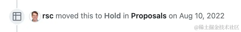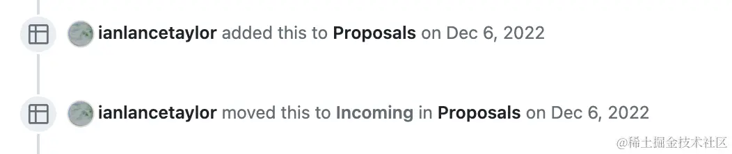 一旦提案被标记为 "已接受",就会贴上 "提案-已接受" 标签,它就会从 "提案" 里程碑移到 "工作" 里程碑中,问题也会被重新使用,以跟踪提案的实施工作。