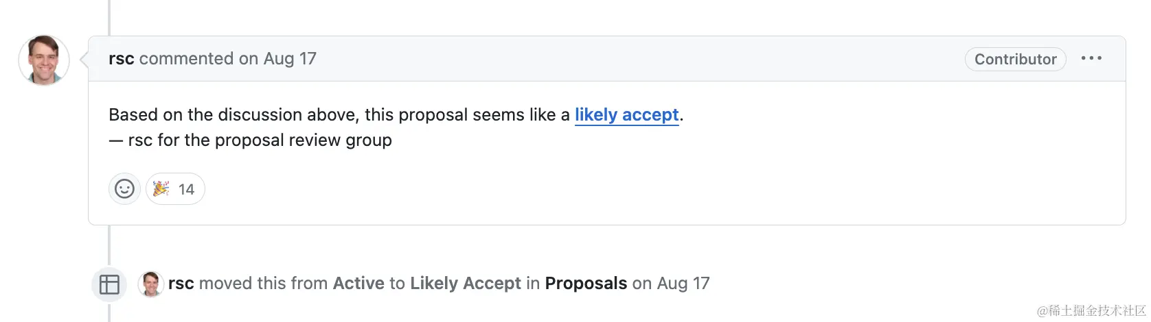Go 提案的整体流程规范是比较明确的,但其并不是每个标签(栏)都一定会用到。从实际的情况来看,会根据 issues 讨论的激烈和复杂度还决定是否使用 “可能接受/可能拒绝” 等场景。