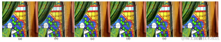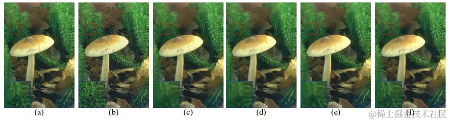 图4 不同图像去噪方法在CBSD68彩色图像(噪声等级为35)上的去噪效果图。(a)原图 (b) 噪声图像 (c) ADNet/28.84dB (d) DnCNN/29.33dB (e) FFDNet/29.30 dB (f) CTNet/29.90 dB.