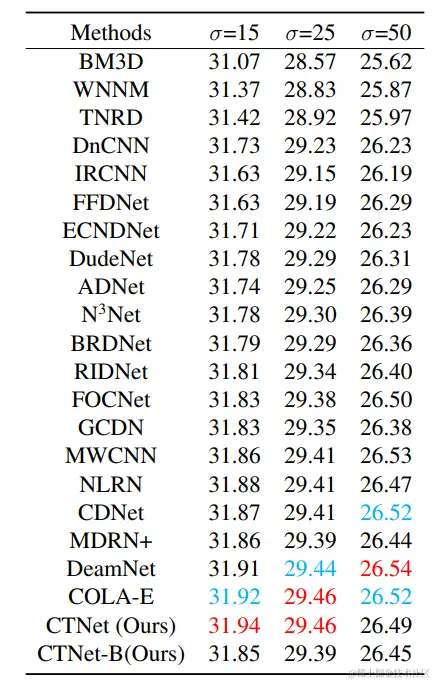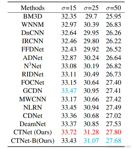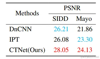 本文提出的方法在Set12,BSD68,Urban100,CBSD68,Kodak24,McMaster,CC,SIDD和Mayo这九个基准数据上超过了很多流行的方法,如:DnCNN、ADNet和IPT等。更多的结构如表1到表8: