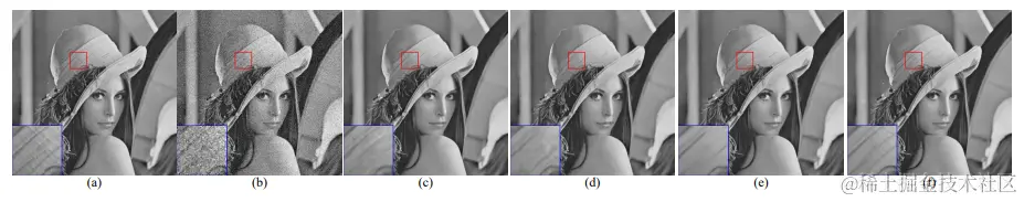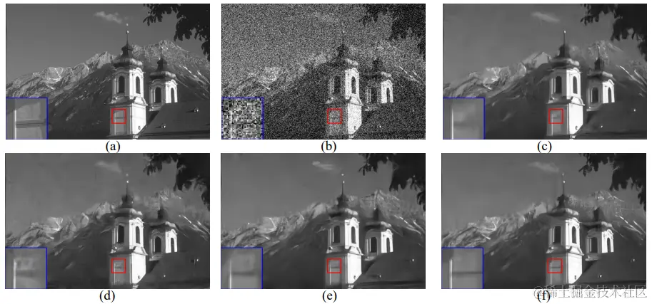 图2 不同图像去噪方法在BSD68灰度图像(噪声等级为50)上的去噪效果图。(a) 原图(b) 噪声图像 (c) ADNet/27.13dB (d) DnCNN/27.92dB (e) FFDNet/28.04dB (f) CTNet/28.16dB.