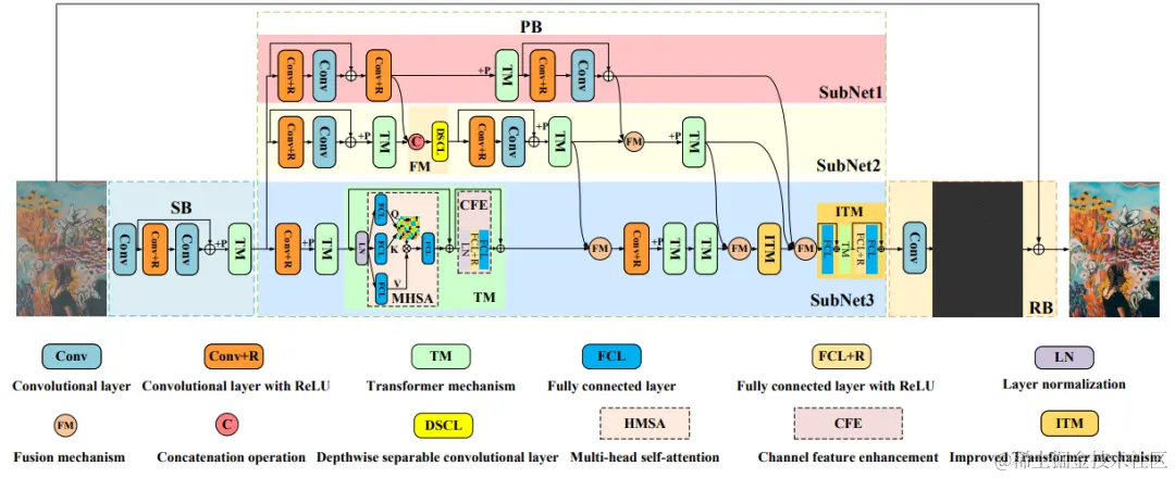 此外,Transformer机制被嵌入到串行模块和并行模块中,以有效地提取互补的显著性信息来去除噪声。最后,使用残差块来重建清晰的图像。
