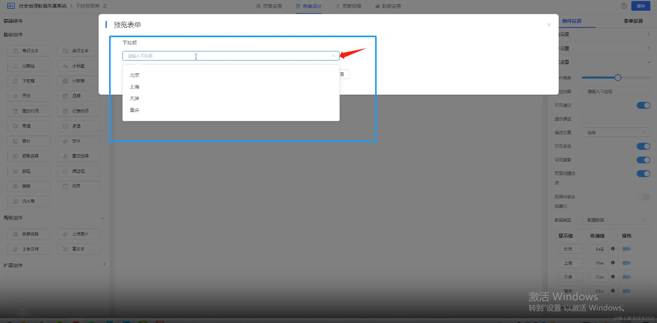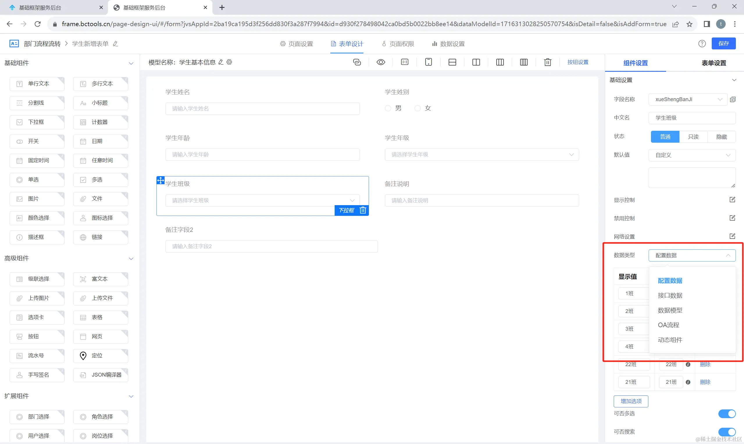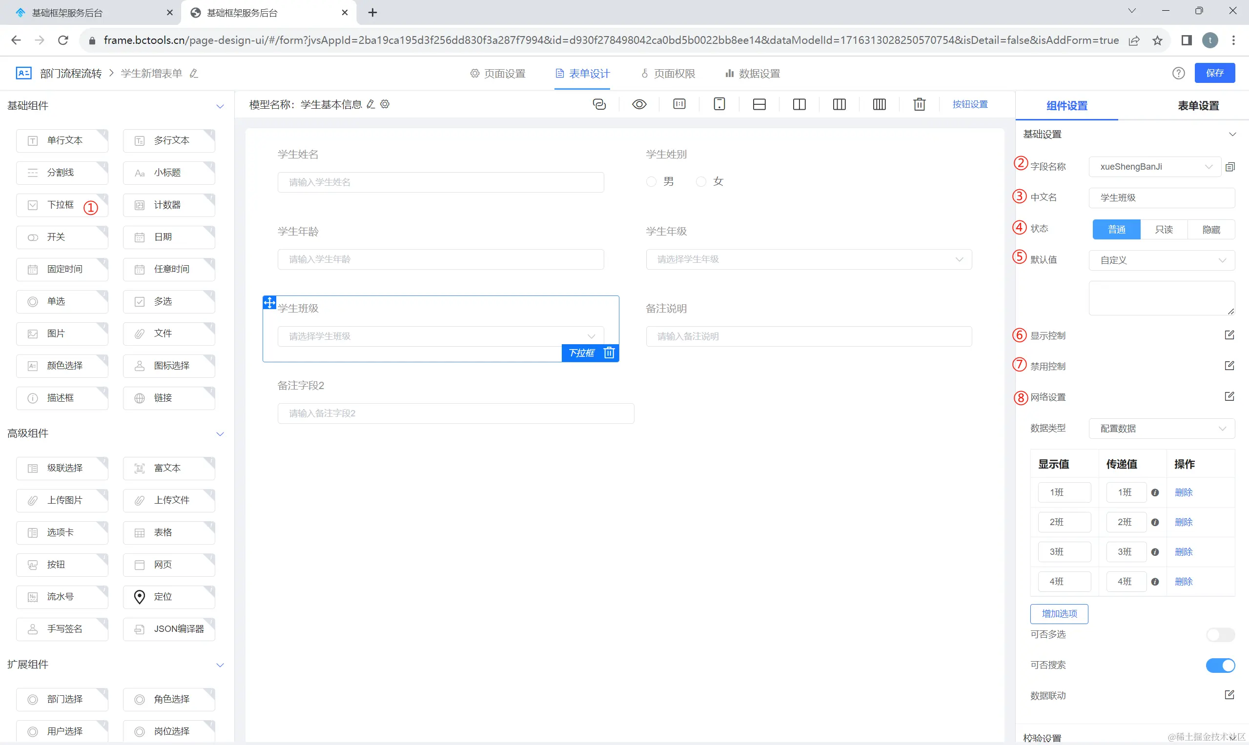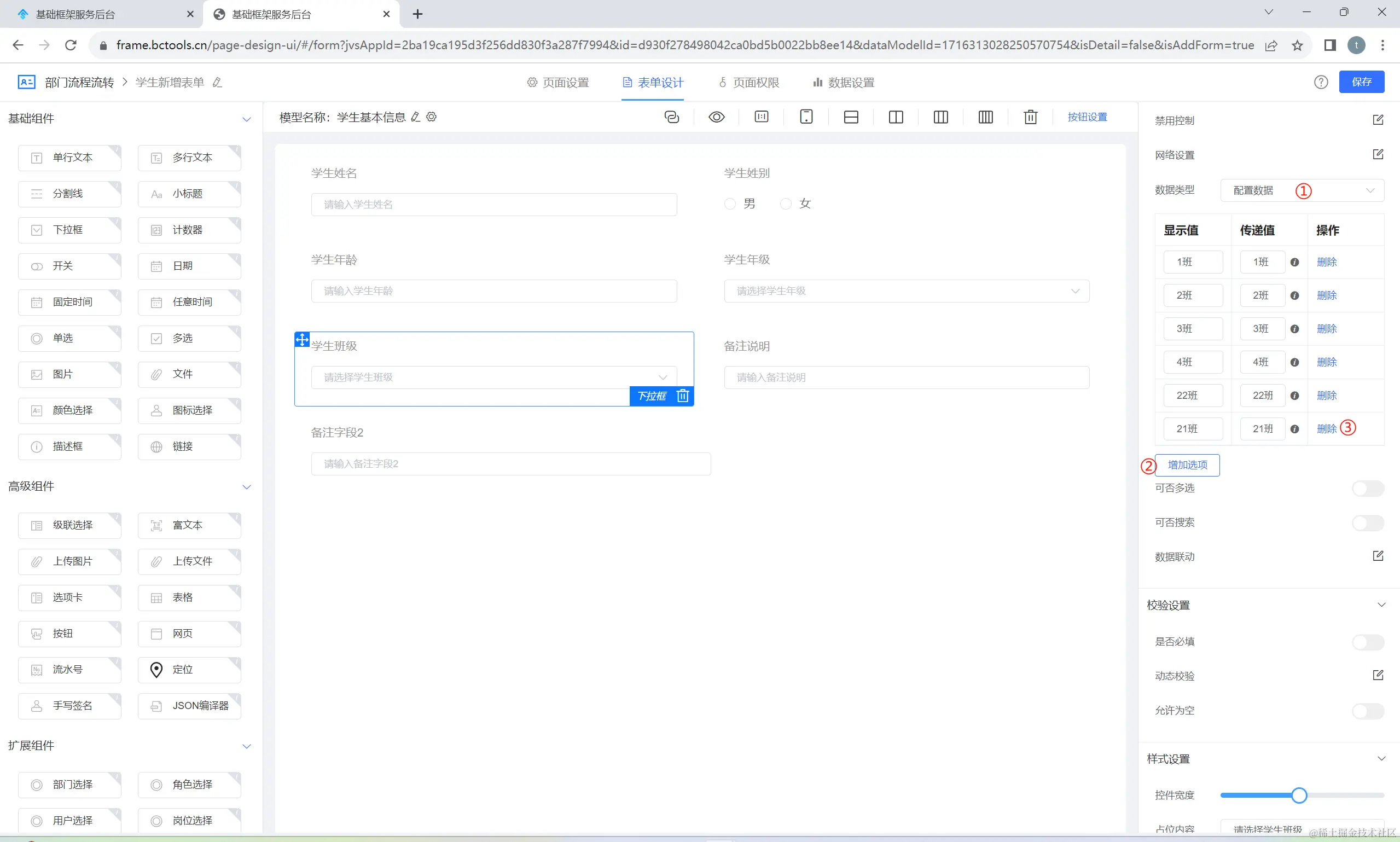①:选择下拉框数据类型为配置数据,系统展示配置数据的相关设置项,本质上是配置枚举值,这里的值是静态选项