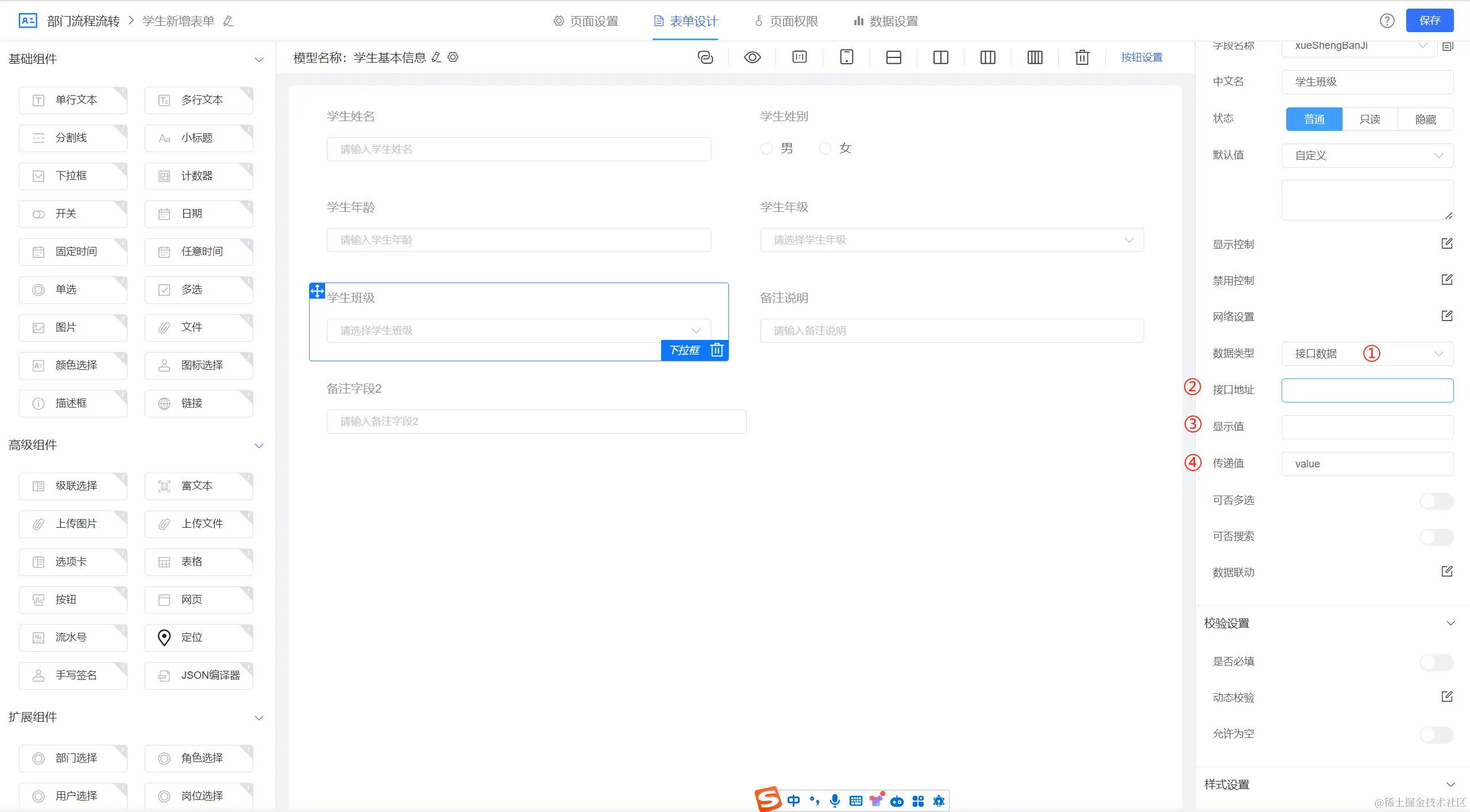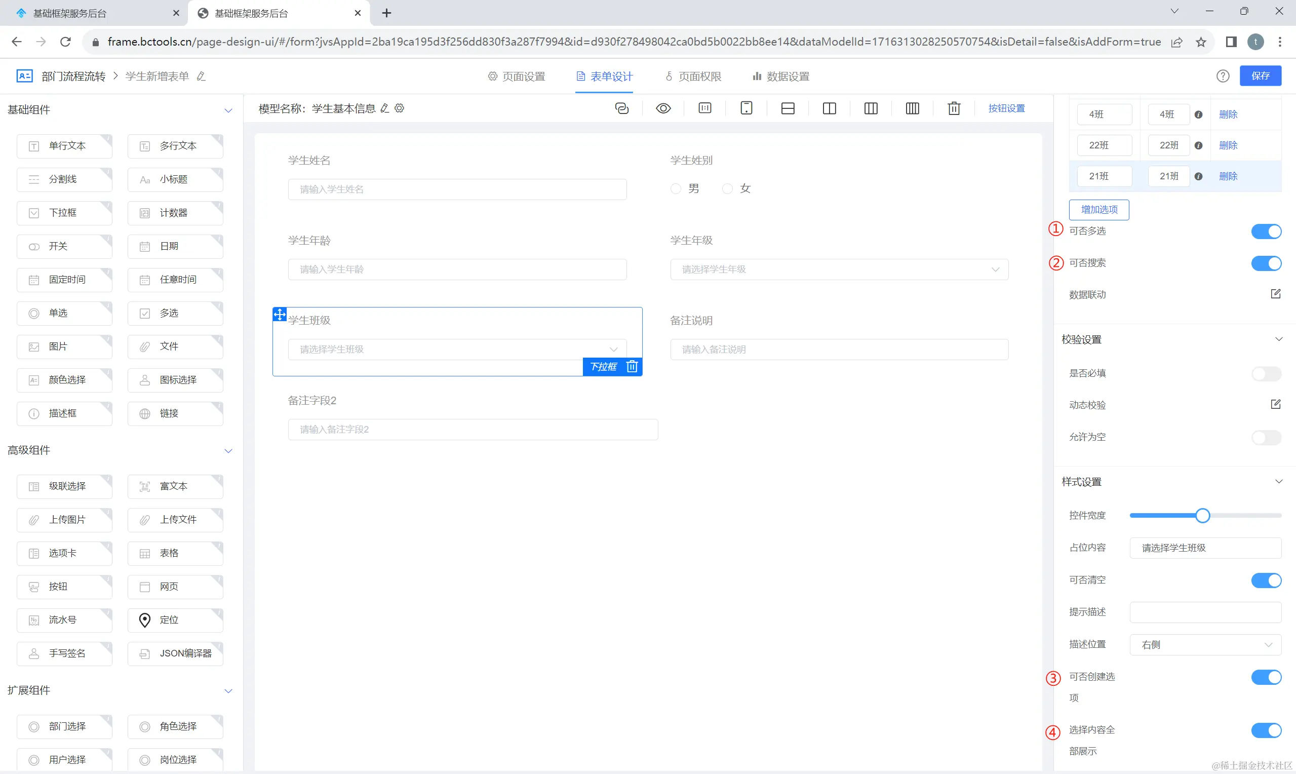 ①:下拉框组件,可以将组件拖拽至表单画布中,实现组件的引用