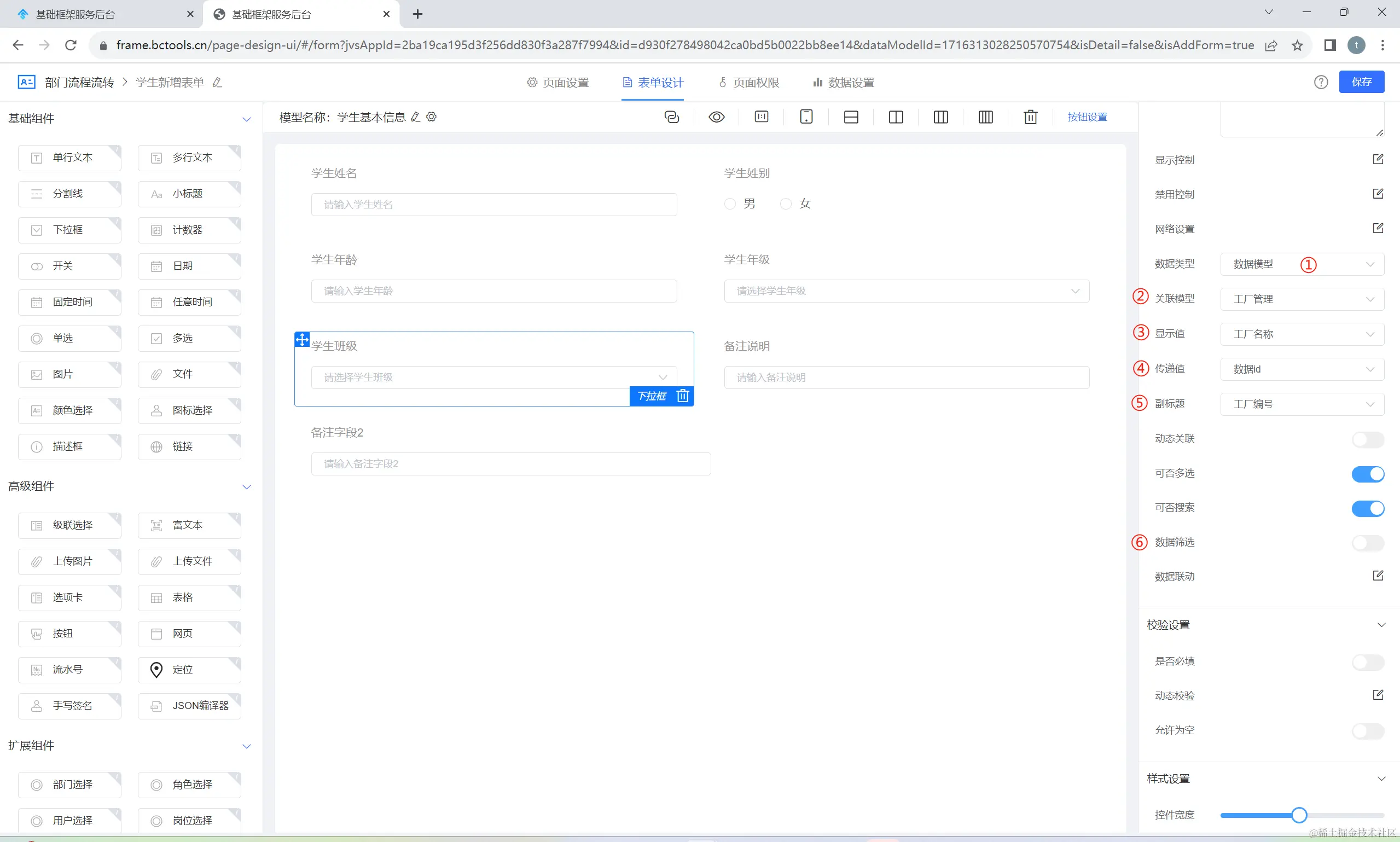 - 下拉组件存储值为其他数据模型的所选择数据的id。