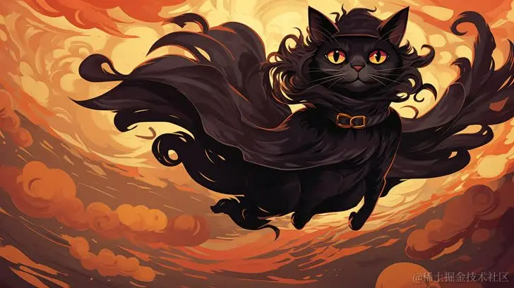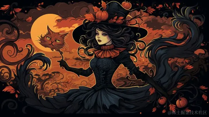 关键词: Halloween illustration, a black cat in witch costumes flying, dark orange, purple, black, rococo art style 万圣节插图,一只黑猫穿着女巫的服装飞翔,深橙色,紫色,黑色,洛可可艺术风格