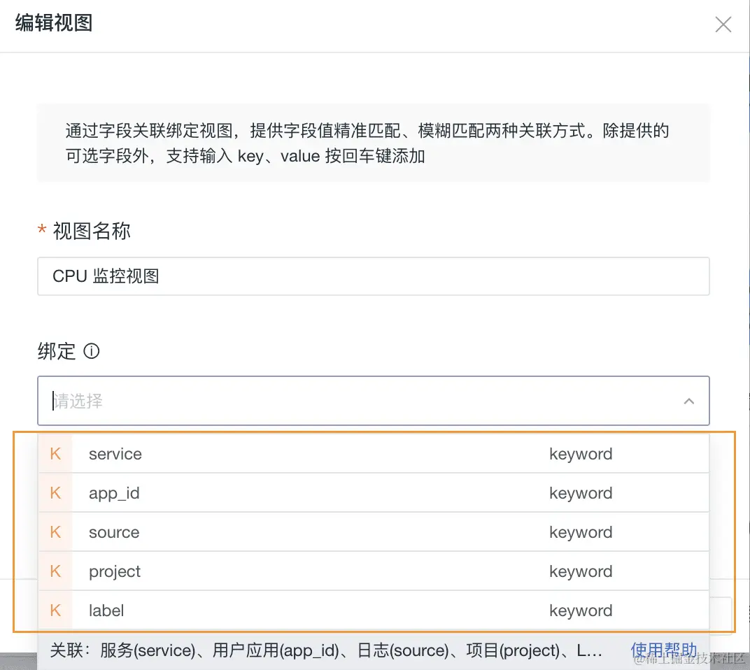当创建好用户视图后,接下来就可以为其设定绑定关系。首先我们需要明确一个知识点,此处我们所讲的绑定关系是指:通过将内置视图与链路服务、应用、日志源、项目或其他自定义字段进行关联绑定,匹配字段值的查看器可通过侧滑详情页查看新增被绑定的内置视图。
