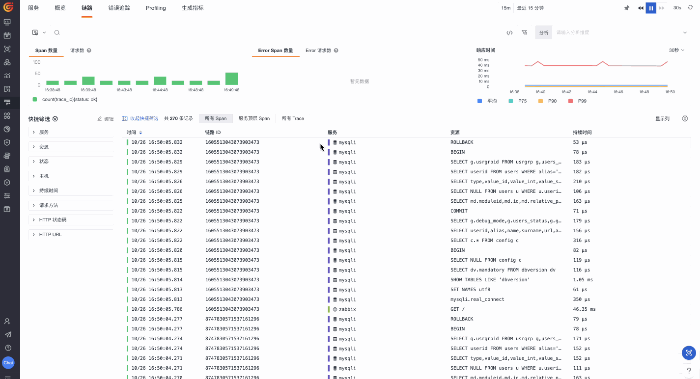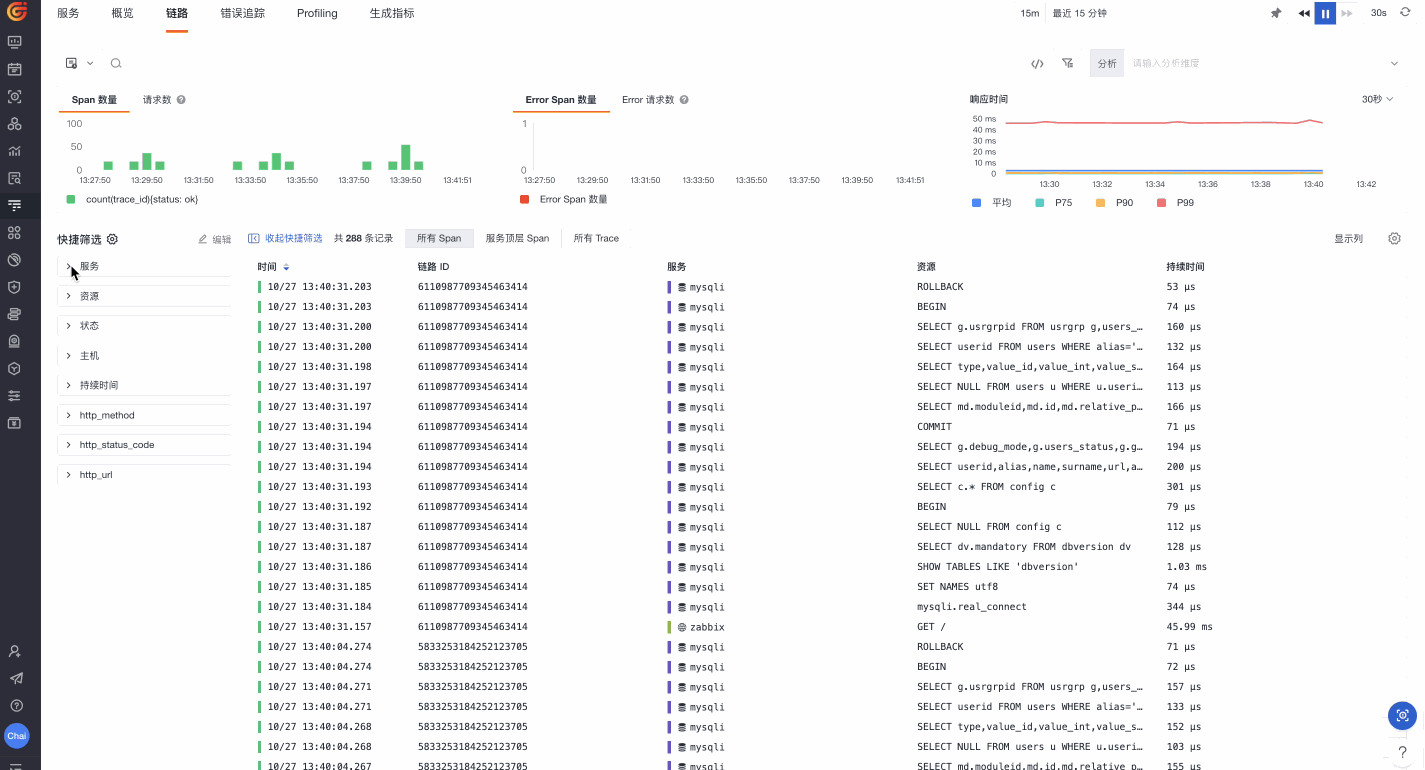 按照上图的操作,我们就完成了链路查看器与【CPU 监控视图】的绑定。在链路查看器侧,带有这一字段属性的链路数据详情页均会自动绑定这一视图。同理,其他查看器内与此字段相关的数据详情页同样也会关联这个视图。我们前往该视图的详情页,也可以看到已经绑定了service:mysqli 这一字段。