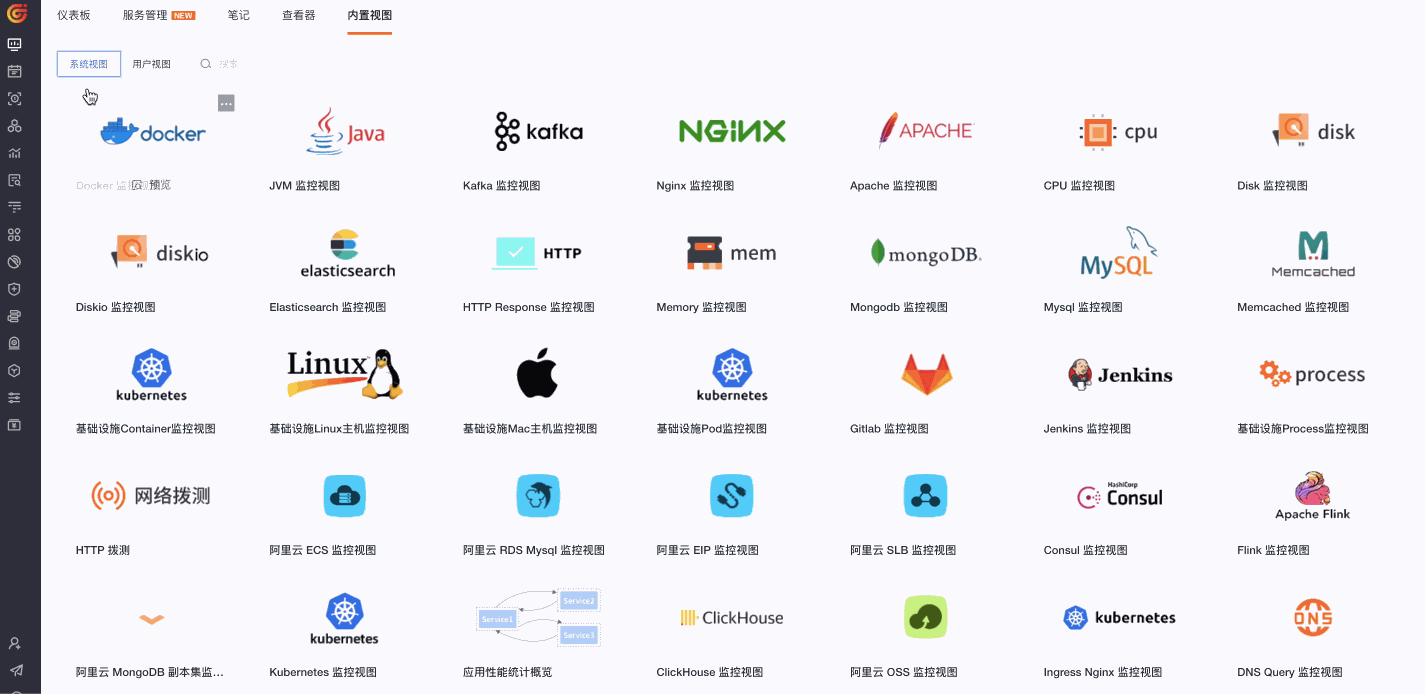 内置视图一般指系统提供的标准视图模版。在观测云中,分为系统视图和用户视图: