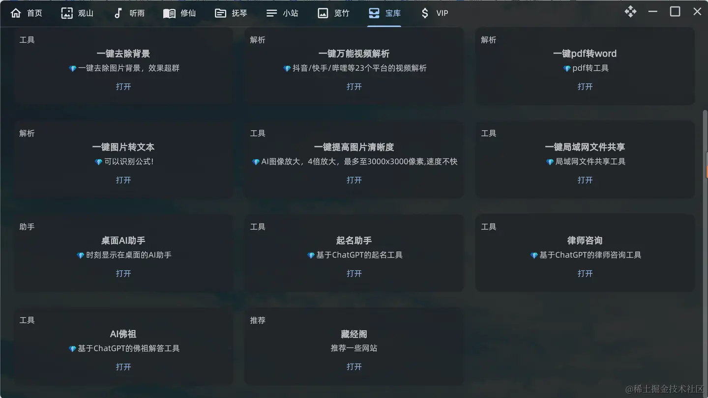 宝库集合了各种有趣的工具和小游戏,涵盖了记忆力游戏、九宫格、数独等。同时,还提供了视频地址解析、PDF转Word、局域网文件共享等实用功能。另外,还研发了AI律师、AI求佛等特色功能,可以在使用过程中获得更多的乐趣和便利。
