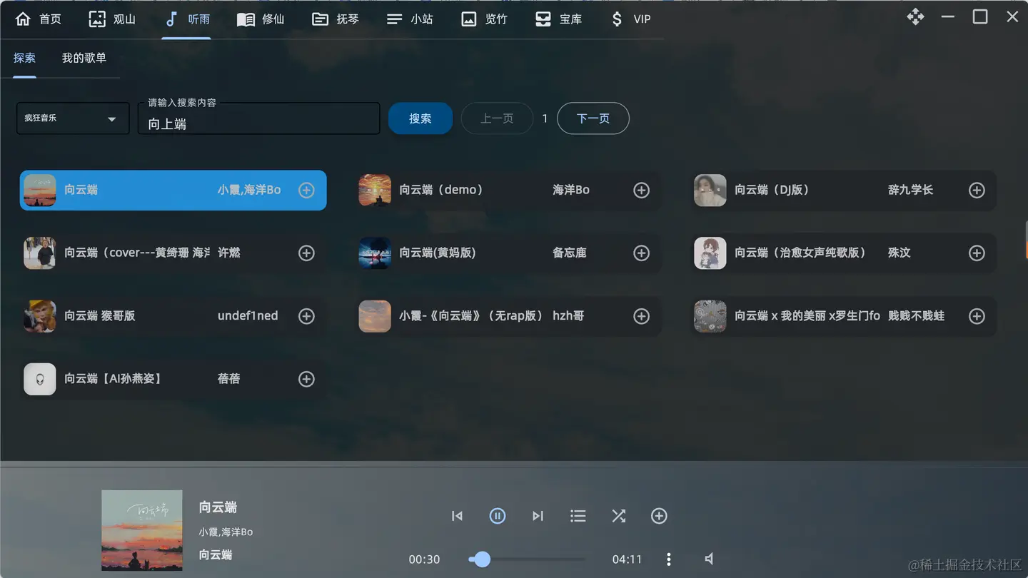 观山页面支持浏览各种类型的图片,有风景图、动漫图、真人图、动态壁纸、COSPLAY、写真、二次元图等,如果你遇到喜欢的图片,还可以一键保存到本地,美滋滋感觉爆棚!无论你对美图还是个人收藏有需求,它都能满足你的需求。 在功能上,可以将浏览的图片或本地图片设为背景,可以下载图片,可以调整图片透明度等。 同时支持快捷键,上下键切换源,左右键切换图片。 听雨 它是一个在线音乐播放器,左上角可以切换音乐源,部分源支持歌词显示。 支持快捷键、暂停开始播放、下一首上一首、单曲循环、随机播放、添加歌单等功能。 拥有强大的功能和广泛的歌曲库,包括新的热门歌曲。无论是像最近风靡一时xxx海还是其他最新的热门歌曲,只需一搜就能马上播放!