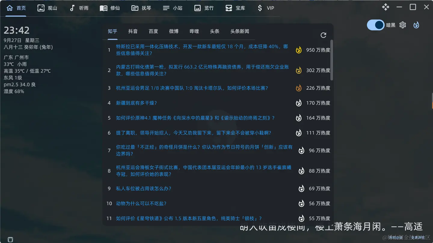 首页左上角显示日期和天气,中间部分有热搜排行,右上角可以切换主题,打开右上角的全局设置,可以进行基本页面设置和保存设置。