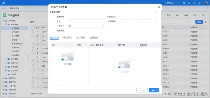 基于元数据模型将表数据开放注册成集成服务。通过集成对象管理中的 “由元数据生成” 功能生成 BE、VO 集成对象,详见集成对象管理。在集成服务注册中选择 BEF 模型注册,填写集成服务的基本信息、筛选条件、排序条件、数据权限配置等信息,保存时根据配置的分页大小、筛选条件自动生成请求参数。
