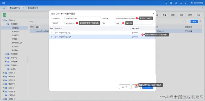 填写类名称(Bean 名称)和方法名称,以及代码所在的服务单元,点击检测进行输入正确性的检查,对方法的入参进行参数指定,检测通过后填写服务的基本信息(参数信息)即可注册完成。