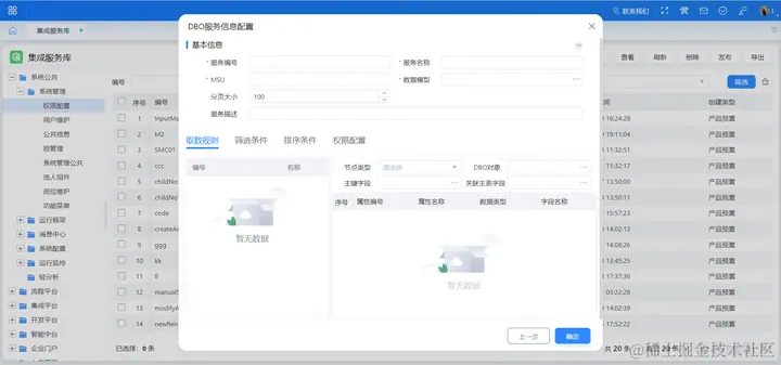 基于 DBO 形式或第三方数据库形式将表数据开放注册成集成服务,首先需要根据业务场景和 DBO 模型,通过集成对象管理功能定义出符合业务所需的数据模型。在集成服务注册中选择 DBO 数据表注册或外部数据库注册,填写要注册的集成服务的基本信息、取数规则、筛选条件、排序条件等信息(外部数据库注册需选择数据连接,详见【集成平台】-【应用集成】-【外部系统管理】-【数据源连接器】),保存时根据配置的分页大小、筛选条件自动生成请求参数。